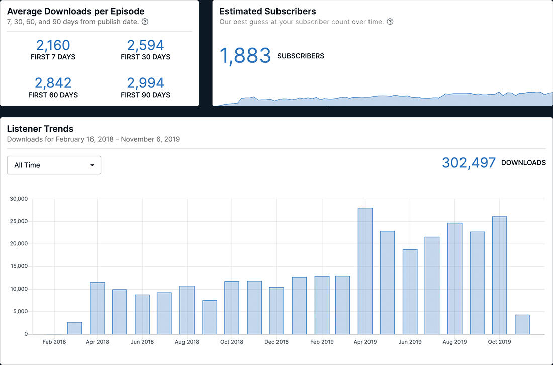 See your average downloads per episode, popular podcast apps, number of subscribers, trends.